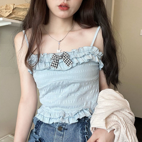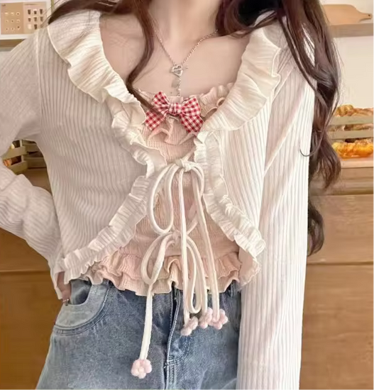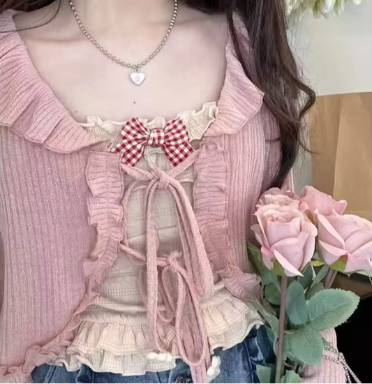 Gingham Bow Ruffle Cami Top and Cardigan Set