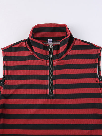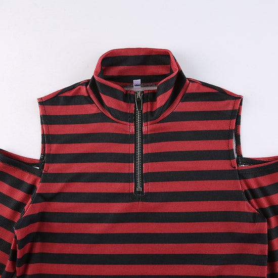 Grunge Striped Open Shoulder Long Sleeve Crop Top